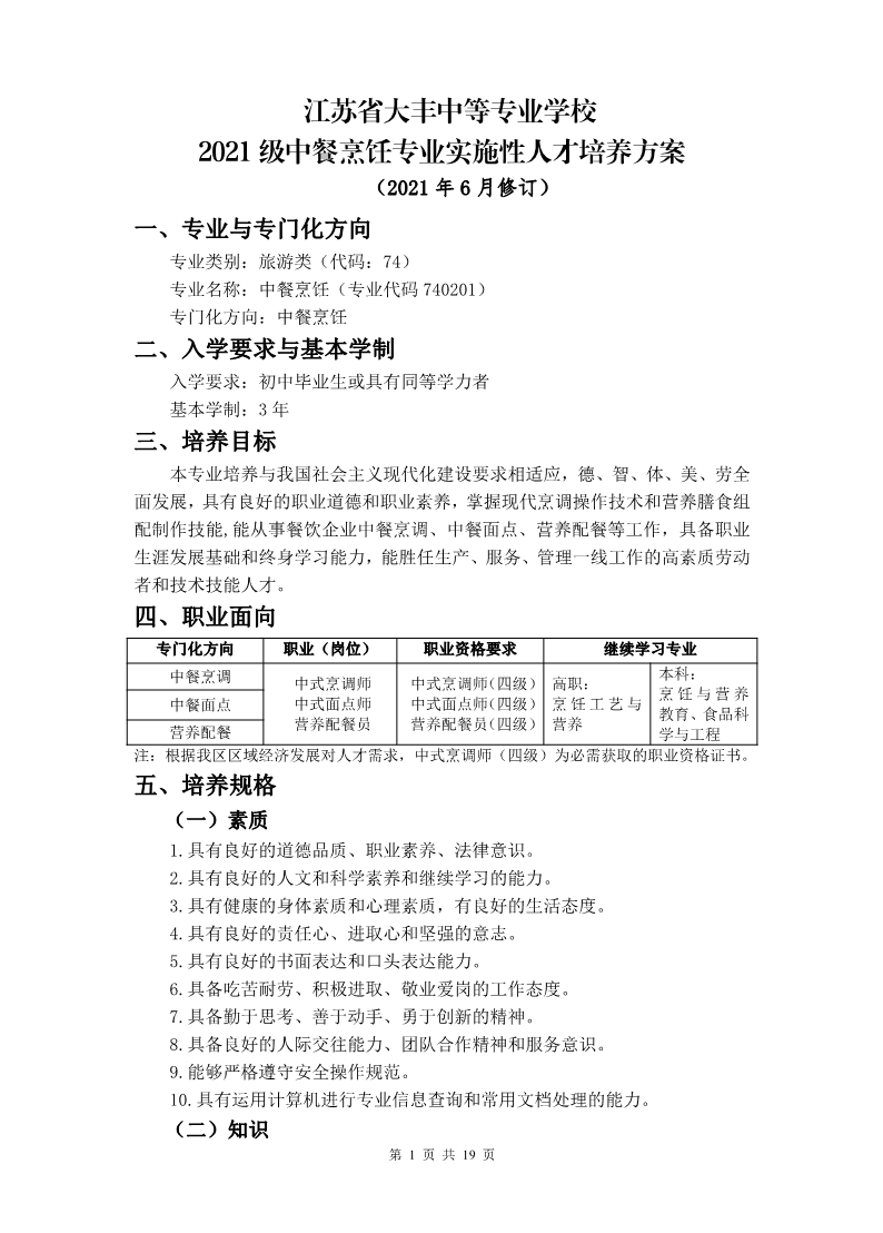 2021级中餐烹饪专业实施性人才培养方案