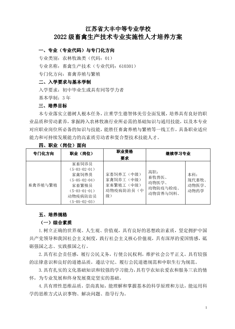 2022级畜禽生产技术专业实施性人才培养方案
