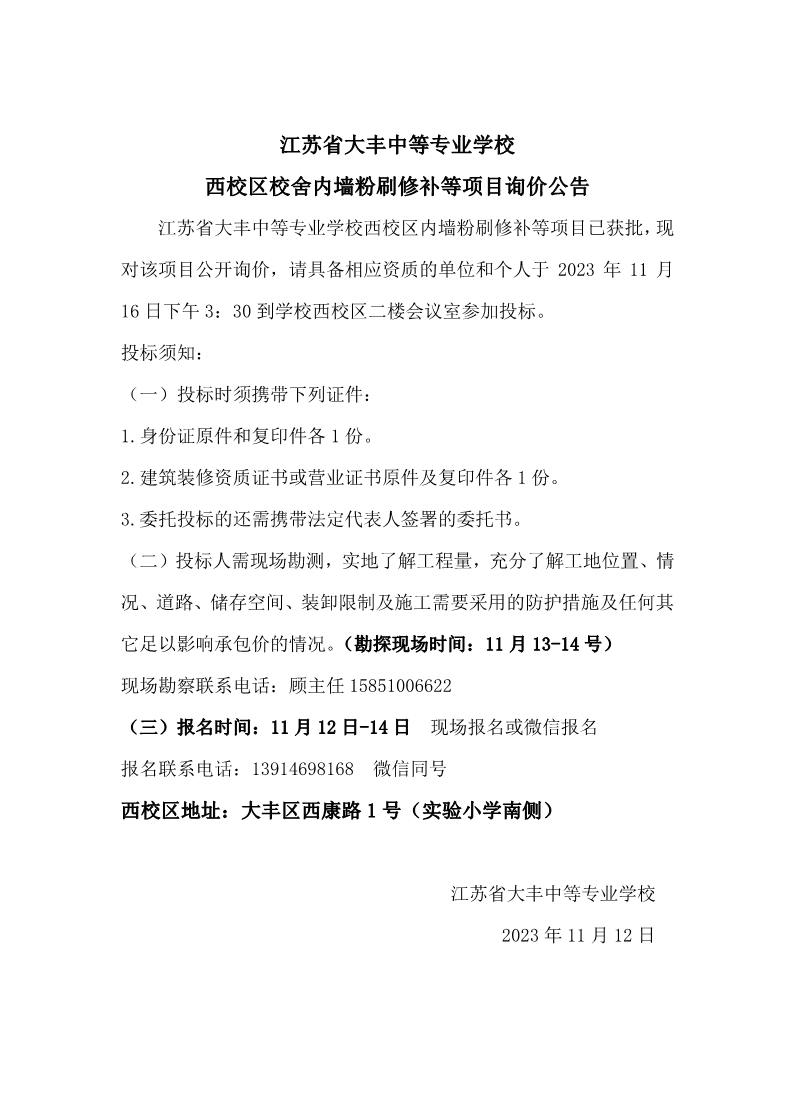 江苏省大丰中等专业学校西校区内墙粉刷修补等项目已获批,现对该项目公开询价,请具备相应资质的单位和个人于2023年11月16日下午3:30到学校西校区二楼会议室参加投标。