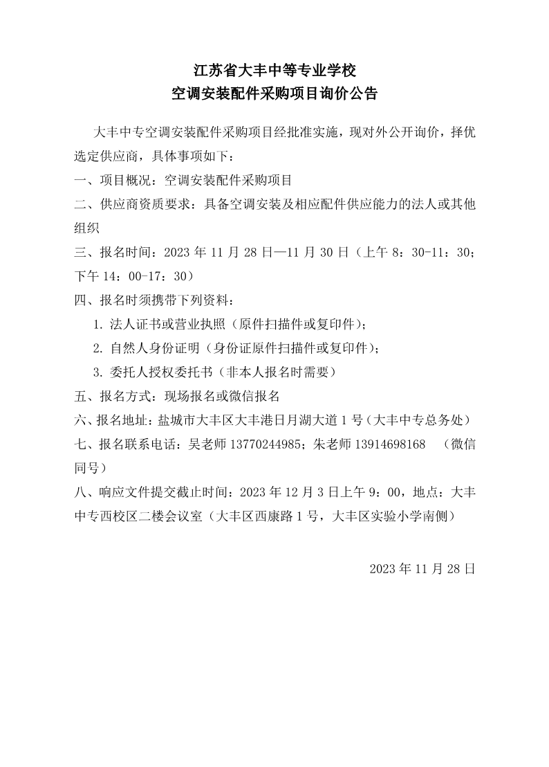 八、响应文件提交截止时间:2023年12月3日上午9:00,地点:大丰中专西校区二楼会议室(大丰区西康路1号,大丰区实验小学南侧)