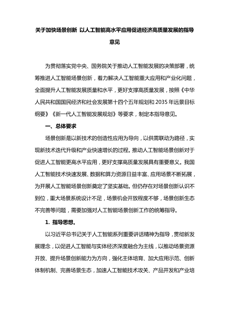 关于加快场景创新以人工智能高水平应用促进经济高质量发展的指导意见