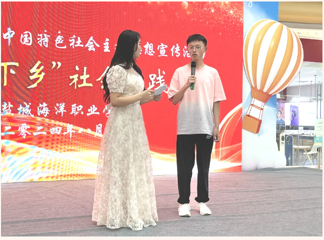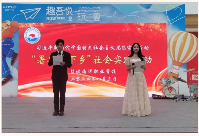 为深入学习贯彻习近平新时代中国特色社会主义思想,全面贯彻党的教育方针,引导和帮助青年学生在社会课堂中受教育、长才干、作贡献,2024年8月3日下午,盐城海洋职业学校志愿者团队在大丰吾悦广场开展了习近平新时代中国特色社会主义思想宣讲“暑期三下乡”社会实践活动。