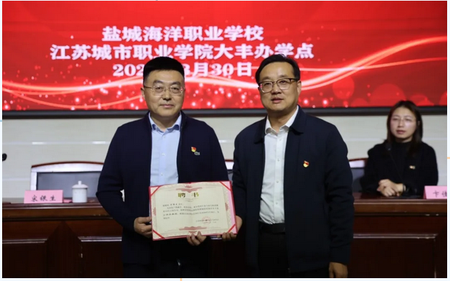 授牌环节中,宋银生为2024级智能制造装备技术专业现代学徒制班授牌,机电工程系五年制高职2412班班主任韩植名接牌。宋银生同时受聘为江苏城市职业学院大丰办学点客座教授,卞佳敏获聘企业导师,未来将参与课程设计与实践指导。