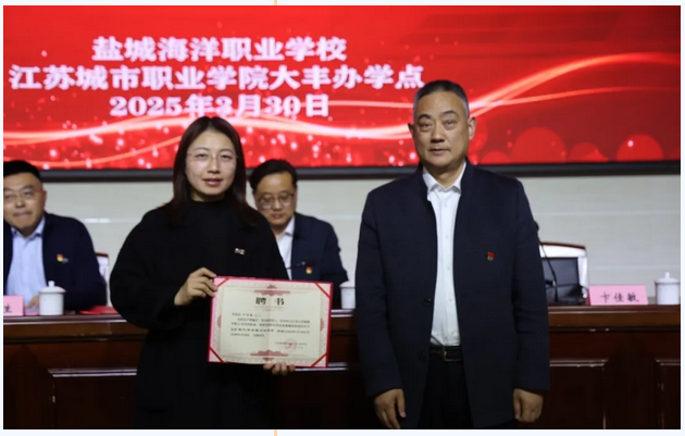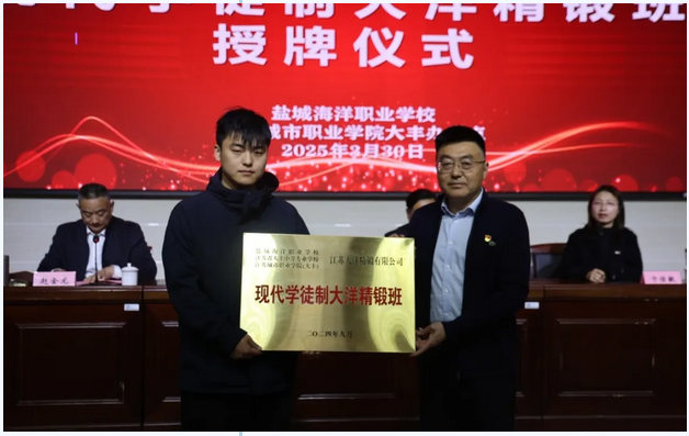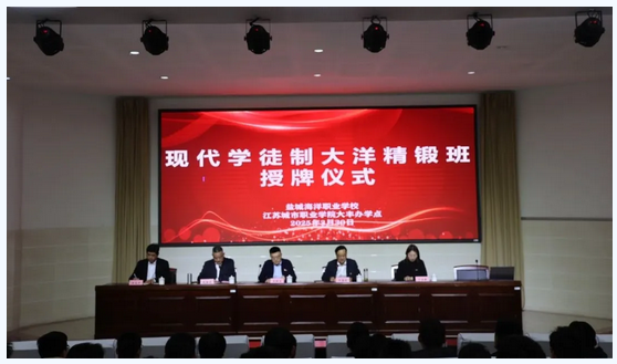 盐城海洋职业学校(江苏城市职业学院大丰办学点)与江苏大洋精锻有限公司校企合作再结硕果。3月30日,双方联合共建的“现代学徒制大洋精锻班”正式授牌。江苏大洋精锻有限公司董事长宋银生、人事部经理卞佳敏,学校党委书记王海涛,党委委员、副校长赵金龙,机电工程系主任及师生代表共同出席活动。