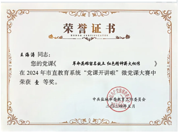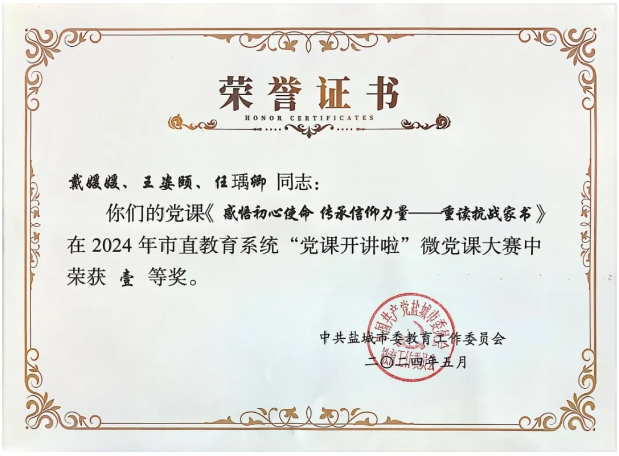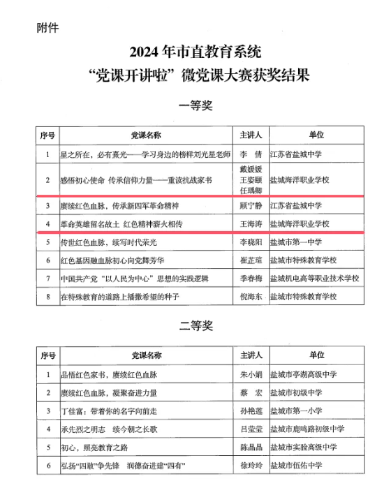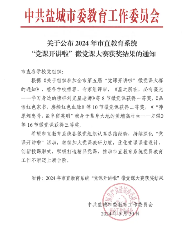 近日,由中共盐城市委教育工作委员会组织的2024年市直教育系统“党课开讲啦”微党课大赛获奖结果公布,我校《感悟初心使命 传承信仰力量——重读抗战家书》和《革命英雄留名故土 红色精神薪火相传》2节微党课获得一等奖。
